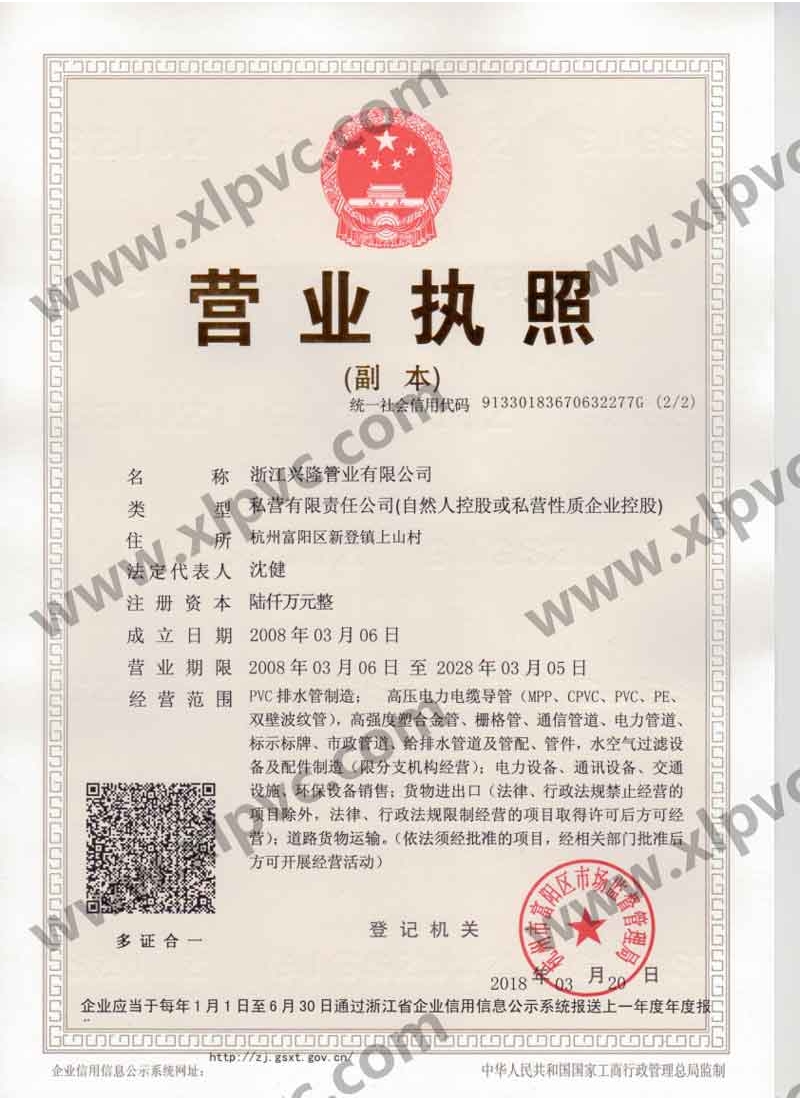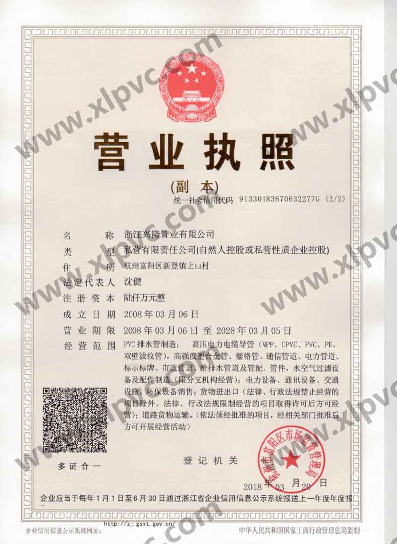 浙江興隆管業(yè)有限公司位于杭州市富陽區(qū)(杭州第九新區(qū)),坐落在新登鎮(zhèn),相距杭州僅60公里,水、陸、空交通運輸十分便利。浙江興隆管業(yè)有限公司前身為富陽興隆塑料制品廠,成立于1992年,2008年改名浙江興隆管業(yè)有限公司,數十年來,公司一直至力于管道的生產,目前公司擁有國內先進的CPVC保護管生產線,HPVC()雙壁波紋管生產線,多孔管生產線,玻璃鋼電纜保護管生產線、MPP電纜保護管生產線。生產的主要產品有:CPVC電纜保護管、MPP電力電纜保護管(頂管)、高強度塑合金管、HDPE給排水管、HPVC()雙壁波紋管、玻璃鋼電纜保護管、埋地通信用的PVC-U多孔管、PE直壁管、PVC-U雙壁波紋管、梅花管等,年生產能力達20000萬米。